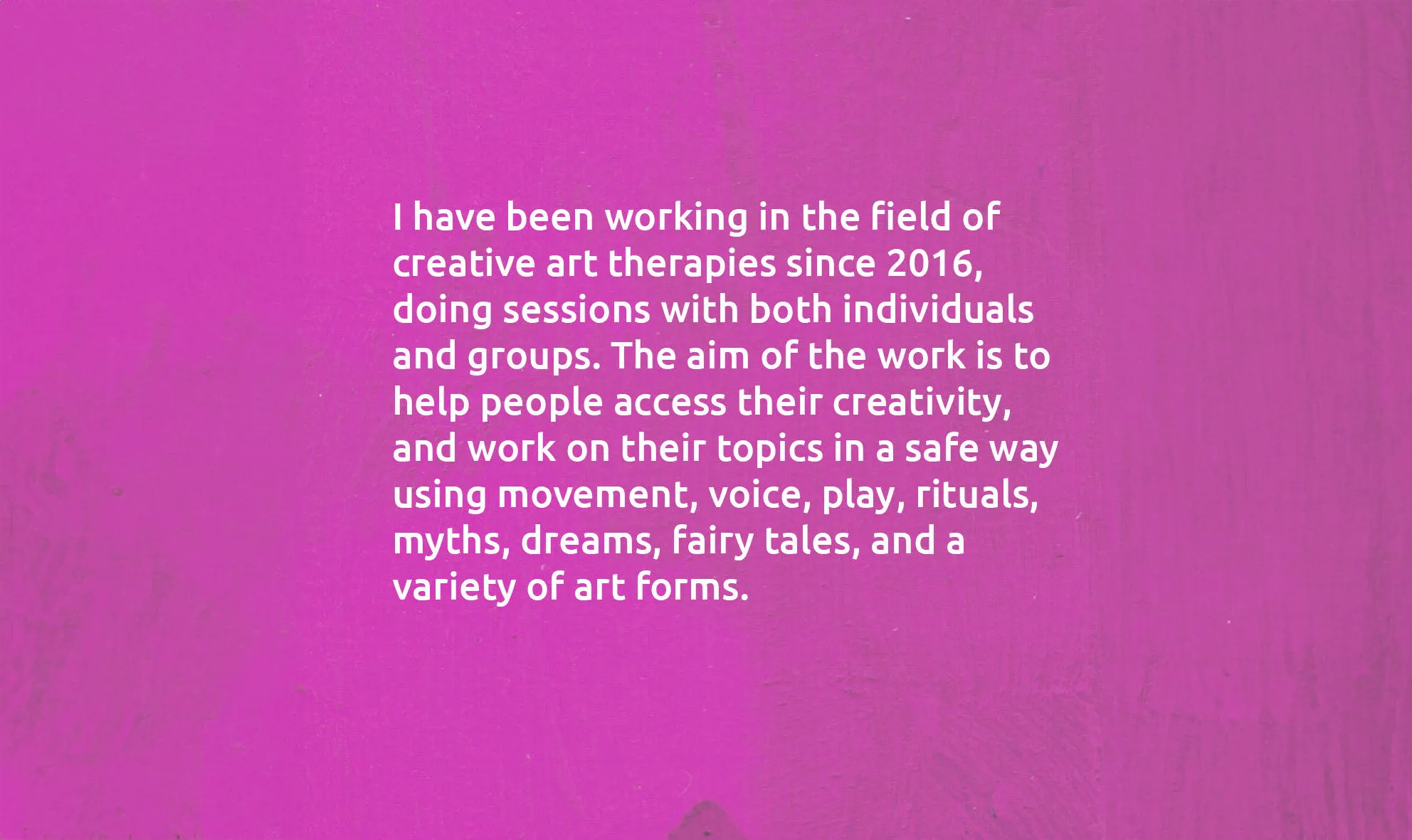 Over the years, I have witnessed how healing can emerge both through dialogue and through the creative space we build together, where clients allow themselves to improvise and see things from a fresh perspective. I believe that creativity plays a vital role: when we awaken the part of ourselves that can play and create, we open the door to a healthier, more balanced relationship with ourselves and with others.